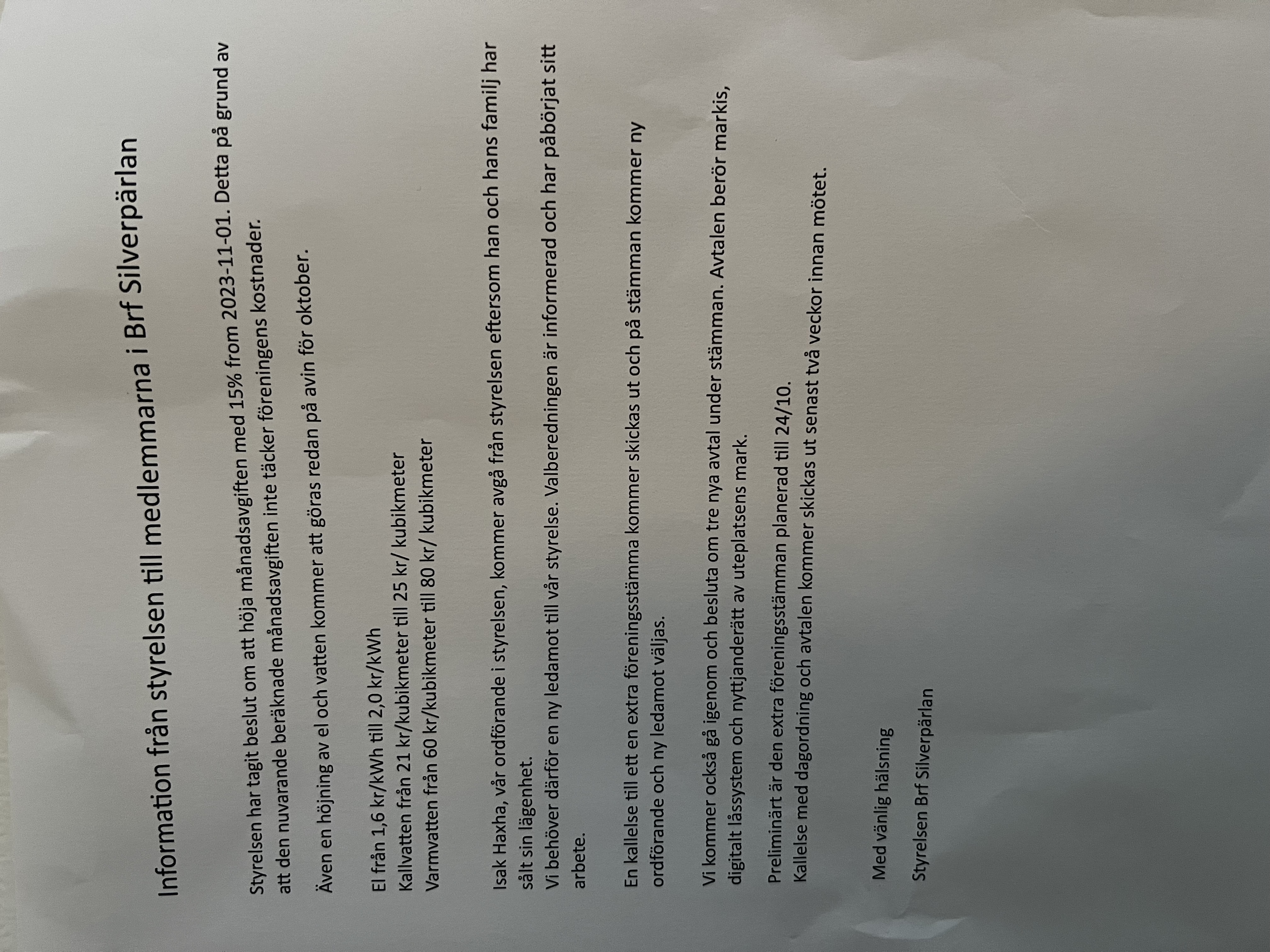 Hejsan kära grannar. Börjar närma sig ett år sedan vi flyttade in. Mycket har hänt sedan vi flyttade in och jag tycker det är fantastiskt kul att utvecklas med er. Vår förening har ju fått en tuff start och vi i styrelsen har fått ta tuffa beslut för att vi som förening skall få en hälsosam ekonomi och med det en trygg framtid. I era brevlådor har ni fått ett infoblad som jag bifogar även här. Månadsavgiften höjs men även vatten och el och det är pga att våra fasta månadskostnader har höjts. Vi har börjat se över dessa kostnader, vad vi ska ändra för att sänka dem. Vi kommer att kalla till en extra föreningsstämma för att igenom några nya avtal, se infoblad. Jag vill också informera att jag avslutar min ordförandeskap i slutet av Oktober då jag skall flytta ut den 9 November. Så ny ordförande och ny ledamot behöver väljas. Vill tacka för denna korta tid och såklart finns jag här för er ifall ni har ytterligare frågor eller om det är något annat ni undrar över. Med vänlig hälsning, Isak & styrelsen